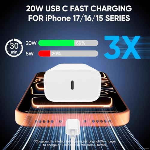 【iPhone 17/16/15 Pro Max Charger Fast Charging Compatibility】This 20W charger kit are perfectly compatible with new version iPhone 17 16 15/ iPhone 17 16e 15 Plus/ i Phone 17 16 15 Pro/ iPhone 17 16 15 Pro Max, Pro 12.9-inch, 11-inch, Air 6th/5th/4th 10.9 inch, Mini 7th 6th 8.3 inch, 10th Generation,and Samsung S25 S24 S23 S22 S21 5G / Ultra / Plus,Android and more cell Phone.